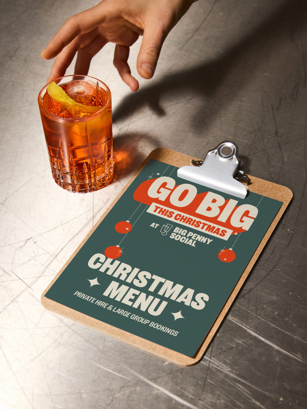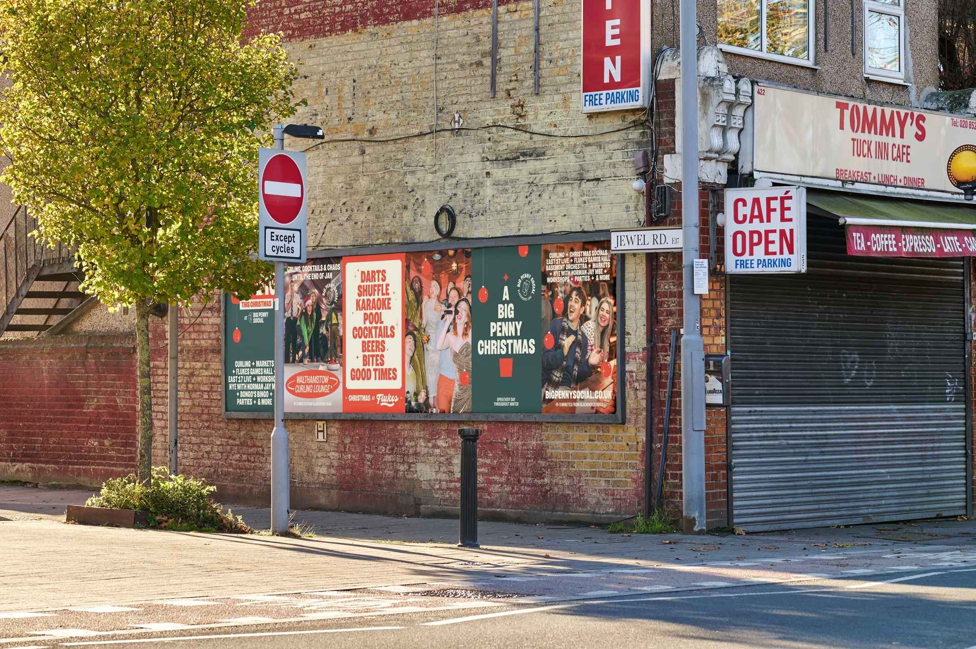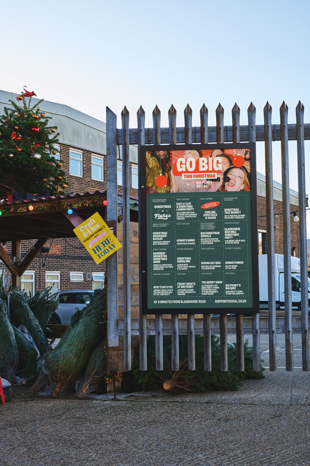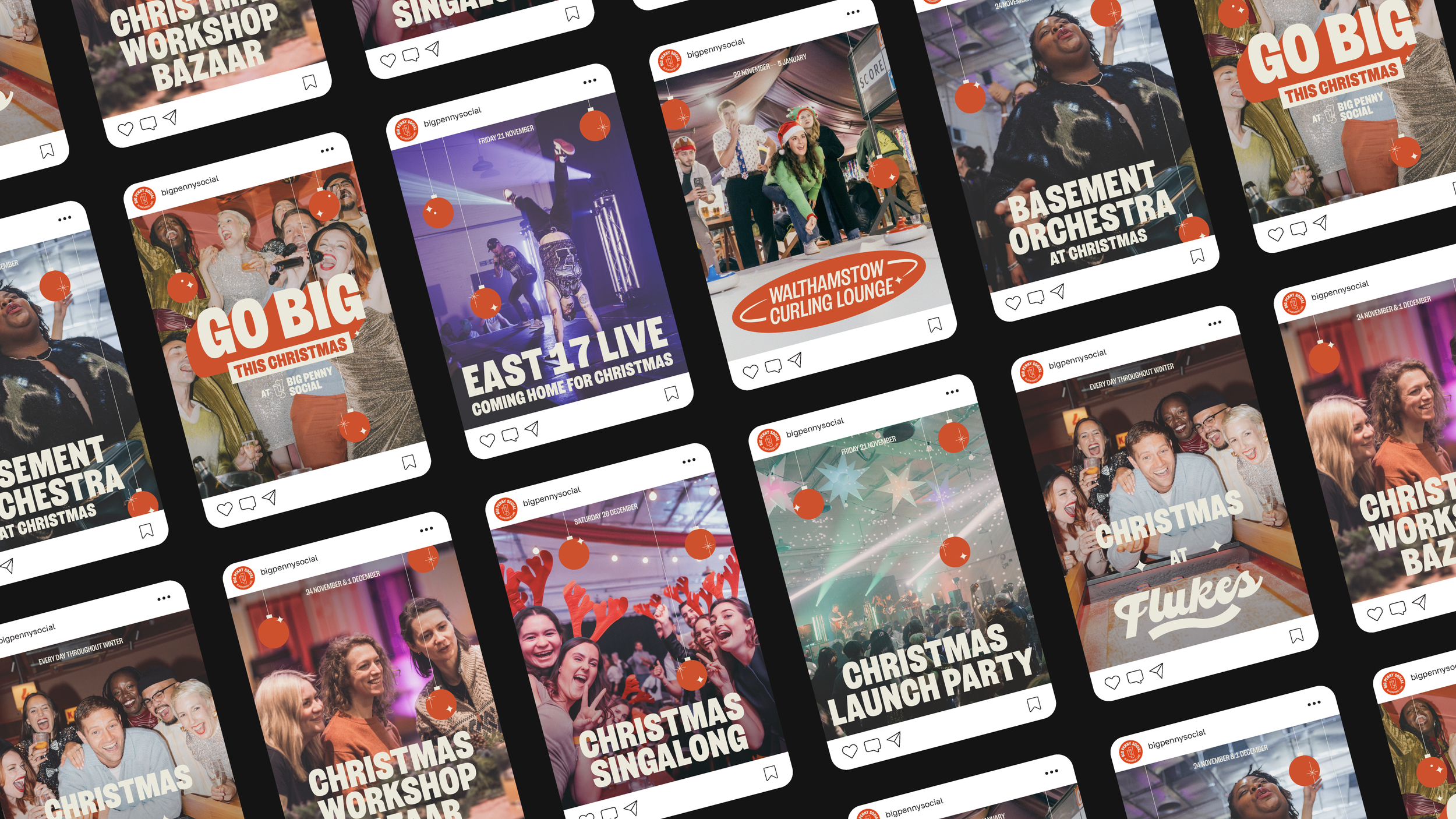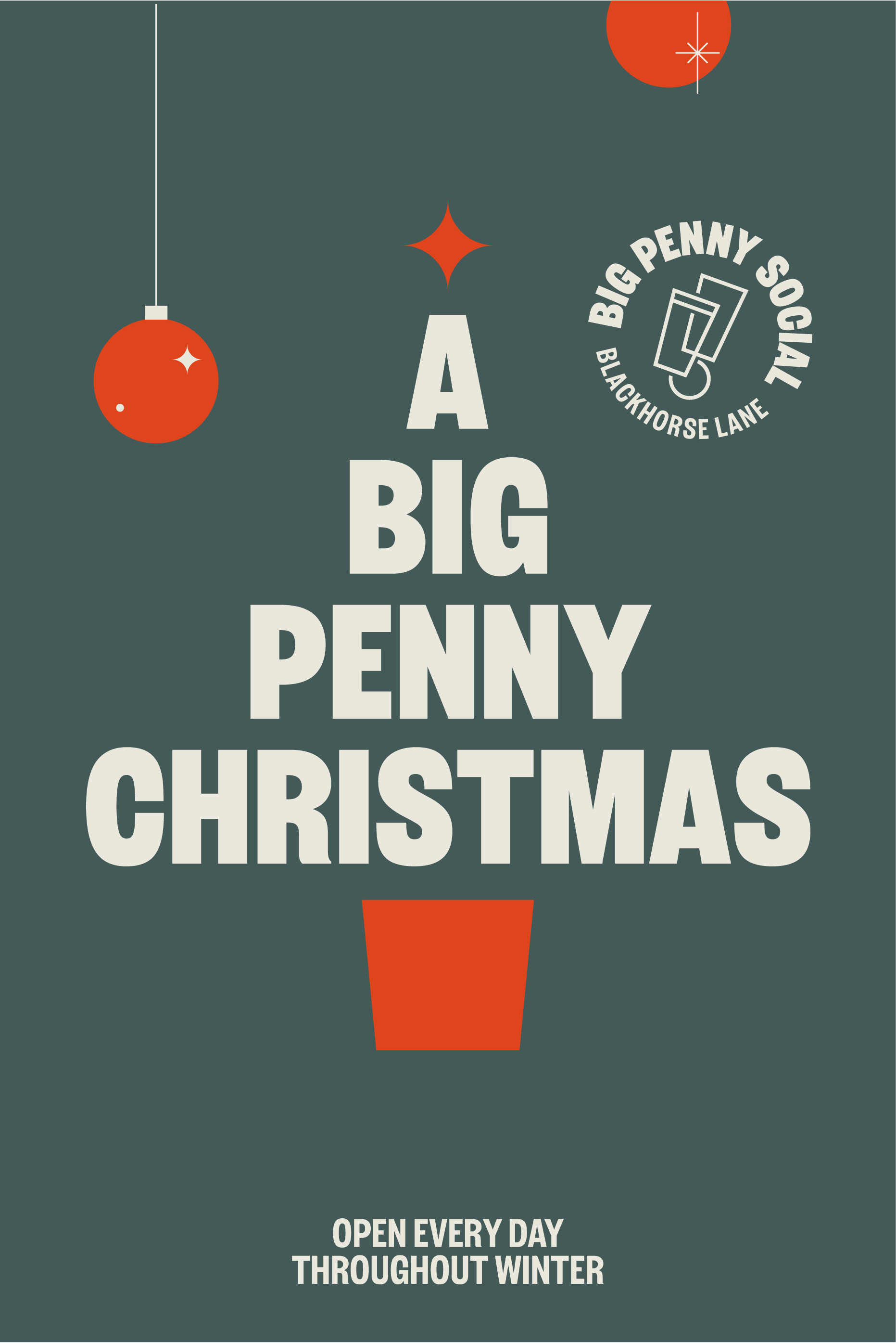 Big Penny Social is a community-focused venue and brewery at the heart of the Blackhorse Beer Mile, Walthamstow. They asked us to bring their larger-than-life Christmas campaign to life through an identity that captured everything happening across their spaces over the festive period – from workshops and markets to immersive experiences and gaming.