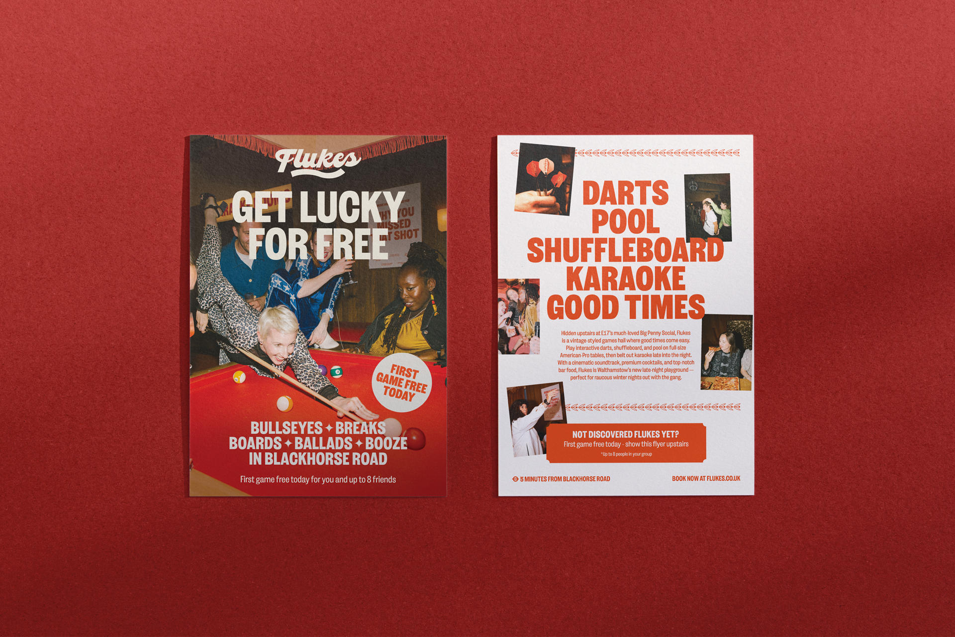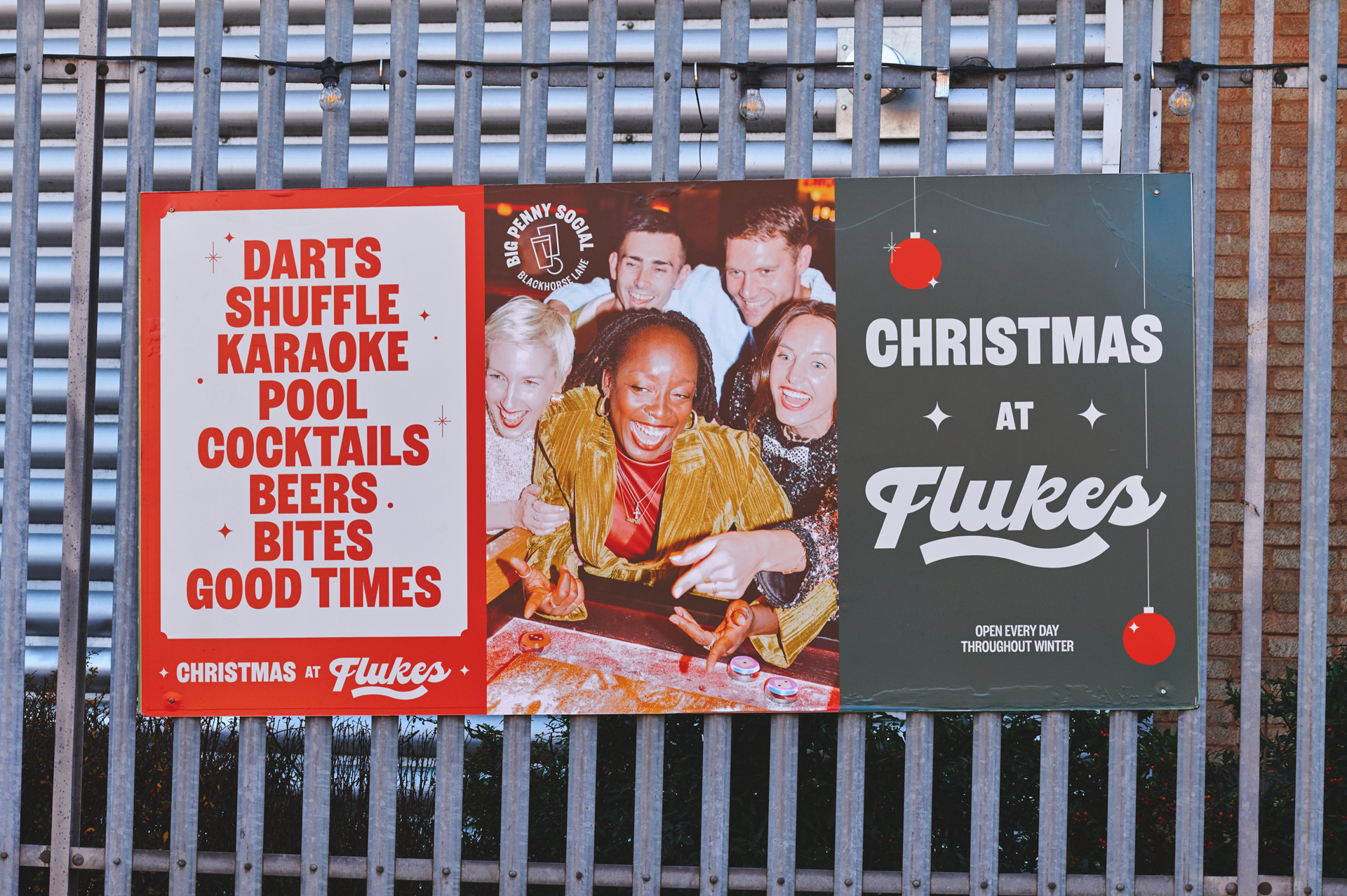 Finally, the games hall, Flukes, received a festive refresh. Diamonds were incorporated across all three logo lockups, adding a sense of excitement while maintaining overall consistency.